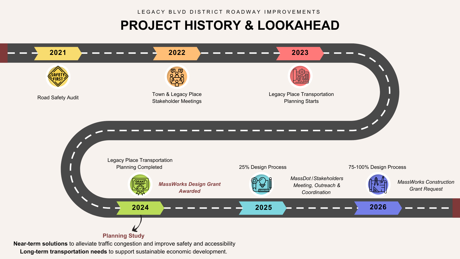 The Town of Dedham was awarded a $1 million grant from the MassWorks Infrastructure Program under the FY25 Community One Stop for Growth in 2024. The grant will advance a Transportation Master Plan and Road Safety Audit funded by Legacy Boulevard property owners. The plan calls for a comprehensive set of public improvements to address traffic congestion and safety concerns of the Legacy Boulevard area and to allow for future growth of the area. The MassWorks funding will produce 100% engineering design specifications, permitting, and bid preparation to enable construction of the public improvements such as roadway widening, sidewalks, and utility upgrades. It is the Town’s intention to apply for future funding from the MassWorks Infrastructure Program for construction after the design is complete.